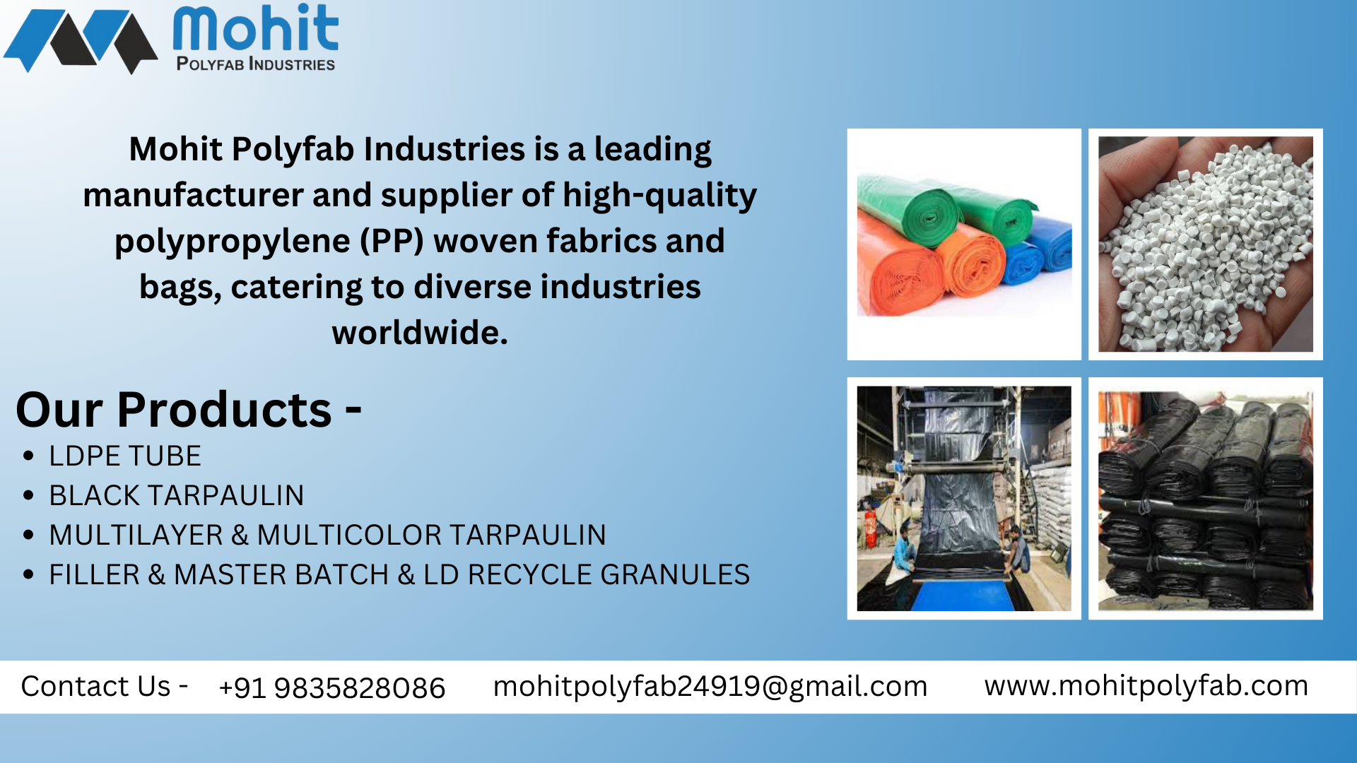 Mohit Polyfab Industries supports LDPE recycling initiatives with film-grade products and related solutions. With modern processing, rigorous QC and customer-focused service, we help convert LDPE waste into high-performing, application-ready materials for packaging, agriculture and construction.